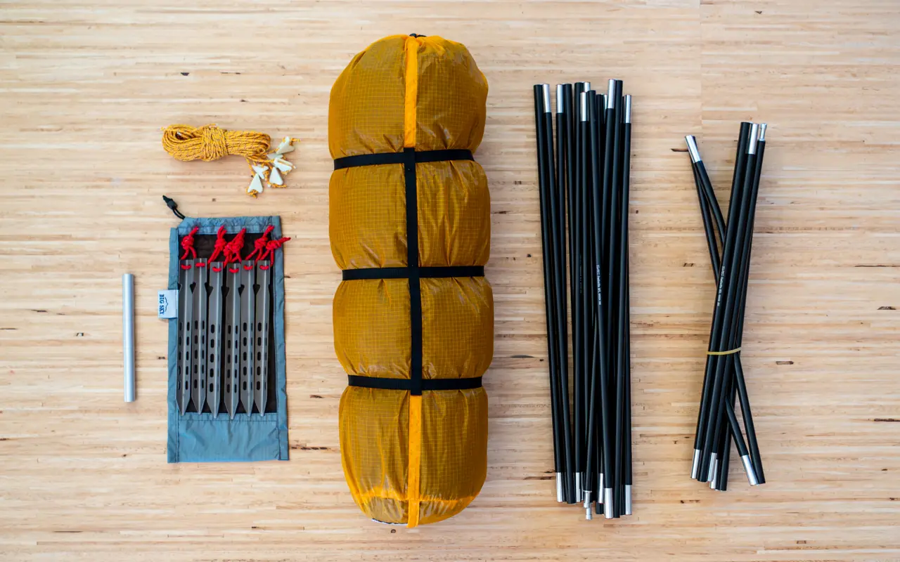 Chinook 1P Komponenten v.l.n.r.: Reparaturhülse, Heringe, Abspannleinen, Zelt im Packsack, Hauptstangen, Querstange