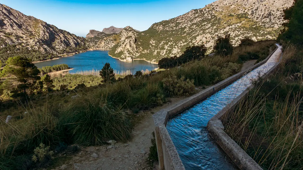 Dabei geht man immer an der künstlichen Wasserführung in den Cuber entlang. Hier fliest dass vom tieferen Stausee Embassament del Gorg Blau hochgepumpte Wasser entlang. Am Ende fallen mir die Parallelen zu den bereits oft gesehenen aber kleineren und älteren Wasserrinnen auf. Wasser ist auf der Insel eben ein knappes Gut.