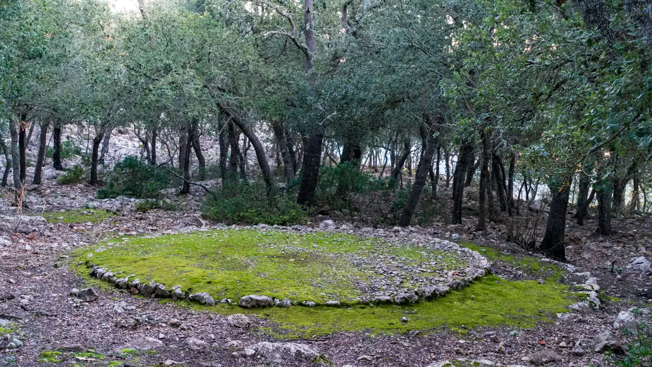 Einen Teil der Etappe bin ich ja schon am Vorabend gegangen. Trotzdem war es vielleicht die anstrengendste Etappe auf meiner Tour. Von Esporles geht es erst über kleine Straßen bis zum Coll de sa Basseta. Hier geht es dann erstmal einige Zeit durch den Wald. Vorbei an alten Köhlerplätzen, Hüttenresten und Trockensteinmauern im bewaldeten Karst bis man am Mola de sa Comua wieder das Meer erblickt.