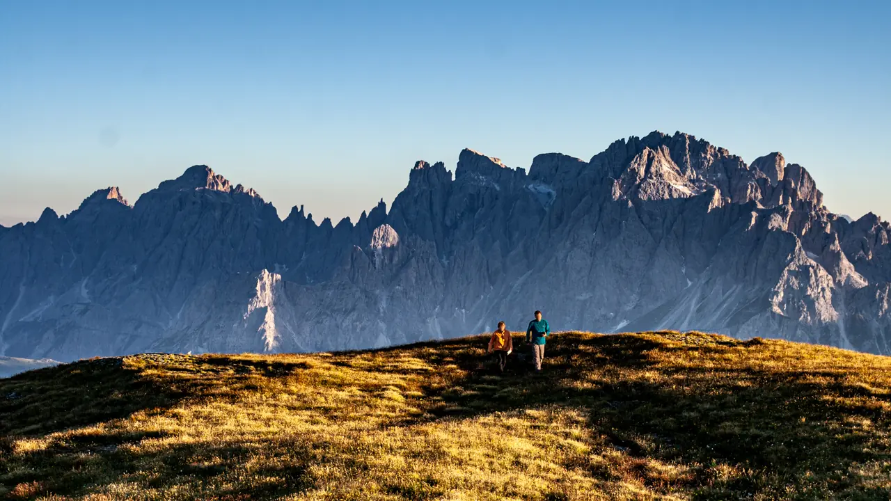 Am Hauptkamm angekommen beginnt hier der eigentliche Karnische Höhenweg. Am Leckfeldsattel öffnet sich der Blick auf die Sextener Dolomiten. Da liegen Sie vor mir: Dreischusterspitze, die Drei Zinnen, der Paternkofel und viele mehr bieten eine tolle Gipfelparade.
