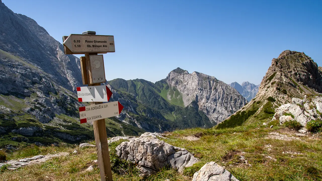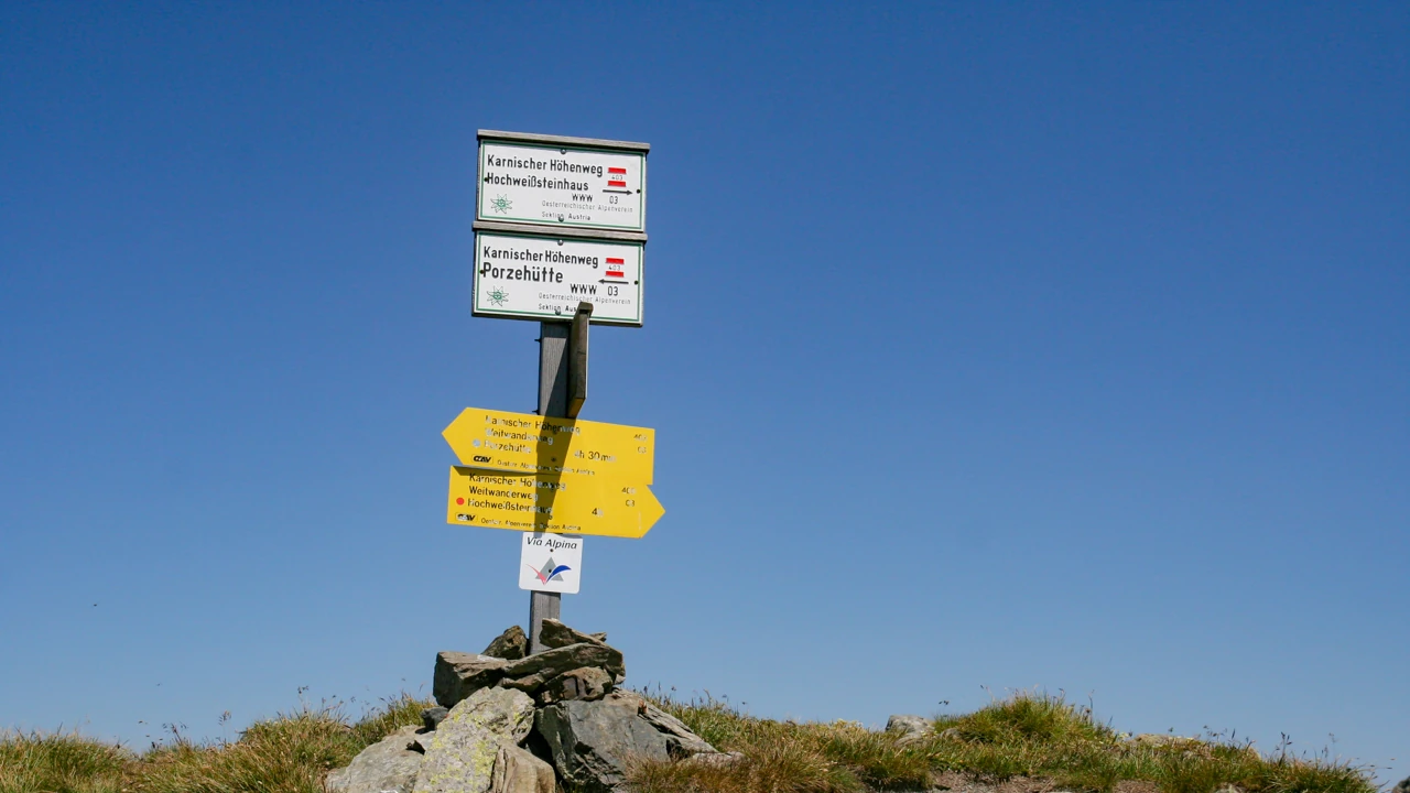 Über die ganze Tour bieten sich phantastische Ausblicke direkt vom Höhenweg auf die karnischen Alpen und die umliegenden Gebirgsgruppen. Der Weg ist gleichzeitig ein Teil des Europäischen Fernwanderweges E10 und des roten Weges der Via Alpina. An Wegmarkierungen mangelt es hier also nicht. Einfach dem Weg KHW 403 folgen.