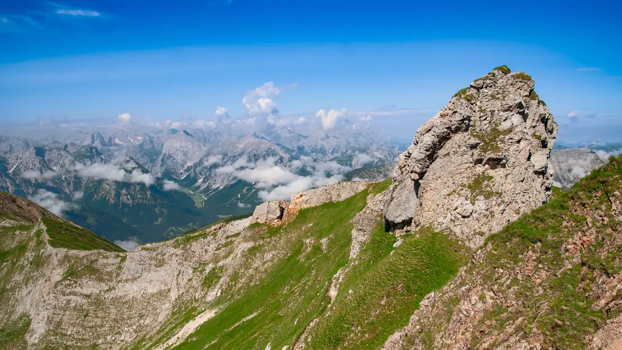 Von der Erfurter Hütte geht es zunächst wieder auf dem sanften Grasrücken nach Norden. Über das Spieljoch queren wir unterhalb der nördlichen Abbruchkante und nehmen den Aufstieg zur Seekarlspitze (2.261m), dem höchsten Gipfel des Rofangebirges. Auch hier kann man wahlweise auf dem Wanderweg zurückgehen oder eine Klettersteigvariante wählen.