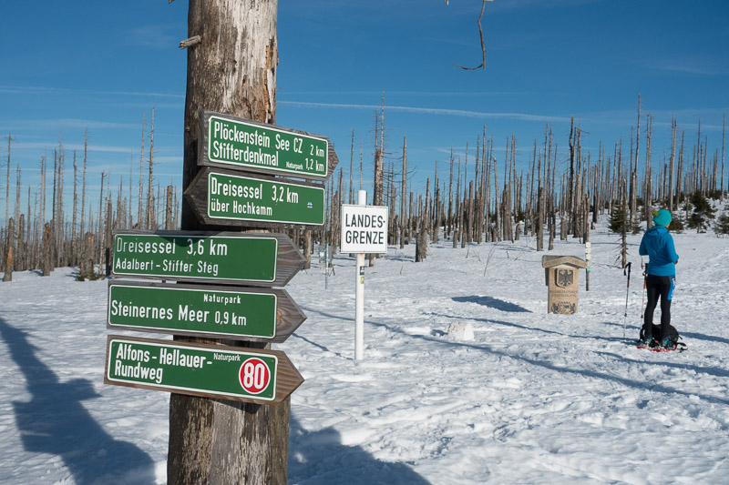 Schon auf dem Weg zum Dreiländereck liegt der bayerische Plöckenstein (1.264m). Der breite Weg über den Kamm ist nach ein paar Tagen ohne Neuschnee schon gut ausgetreten. So versuchen auch zahlreiche Winterwanderer ohne Schneeschuhe ihr Glück und rutschen auf dem Schnee herum. Über das gut besuchte Dreiländereck erreicht man dann nach einem letzten Aufstieg den Gipfel des Plöckenstein (1.379m).