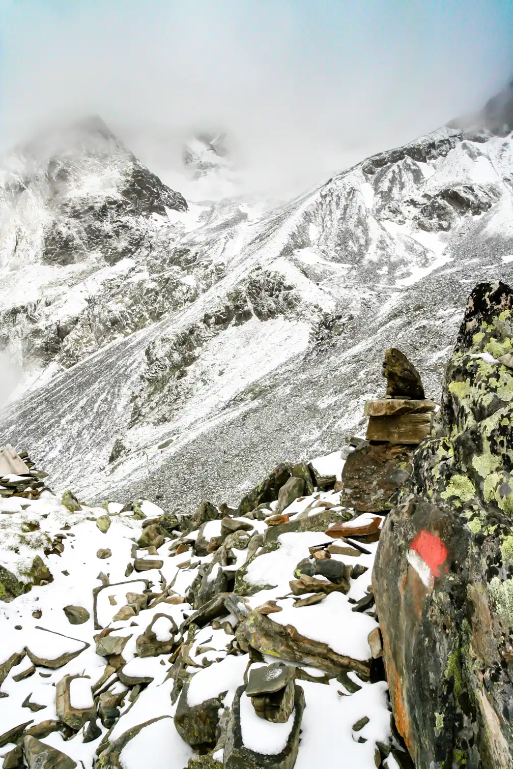 So finde ich dann auch Dank Schneestangen den Einstieg in den Aufstieg zum Grawagrubennieder (2.881m). Teilweise vereistes Blockwerk und einsetzender Schneefall machen es nicht leichter und man sollte hier schon wissen was man macht. Im weiteren Aufstieg gibt es dann noch ein schönes Schneeefeld und einige Meter seilgesicherte Kletterei. Der Grawagrubennieder bietet uns alle Spielarten des Bergwanderns auf einmal.