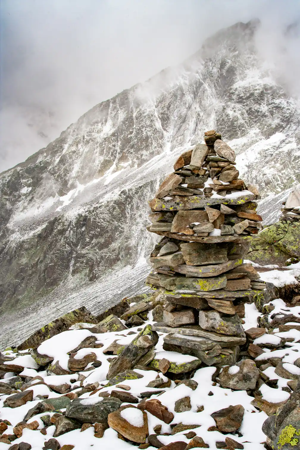 Ich starte im Nebel. Macht nichts, die nächsten Stunden steht noch keine Gipfelbesteigung an. Um die Aussicht ist es natürlich trotzdem schade. Durch die Platzengrübe geht es weite Strecken den Gebirgsbach mehrfach querend über Blockwerk. Bei einsetzendem Schneefall geht es dann über den Schrimmennieder (2.714m) zur Regensburger Hütte.