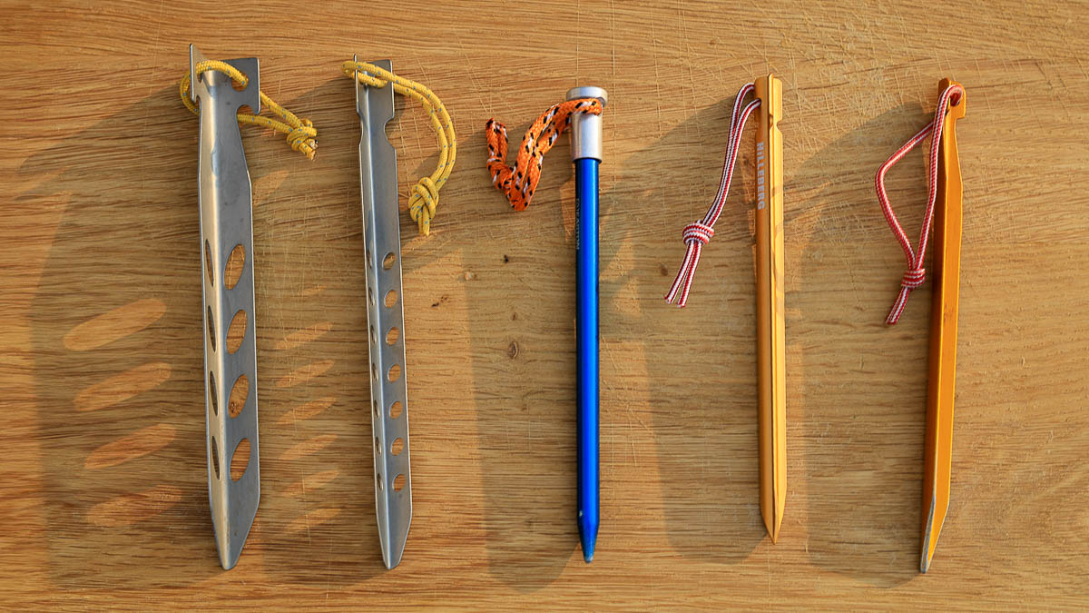 Standardmäßig nutze ich 16 cm lange V-Heringe. Für spezielle Bodenverhältnisse nehme ich zusätzlich vier Spezialheringe mit oder ersetze gezielt einige V-Heringe, um Gewicht zu sparen.
